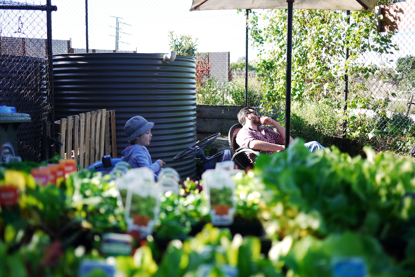 We were immediately impressed by the contemporary, eco-friendly architecture and enjoyed walking on the paths, around the abundant vegie patch and down to the cafe where mums, dads, bubs and toddlers basked in the sun. Che ran off to meet new friends and Daniel and I settled under a grapevine decorated with prayer flags. We sat and watched for a good hour; everyone around us seemed so delighted to be there, blessed to have such a wide, green, lush space for their children to play in. Looking out over the hill I thought about the 350000 people who walk through the gates each year – to buy from the permaculture nursery, peruse the weekly organic marketΒ or meet with their local mother’s group for a catch up over chai.